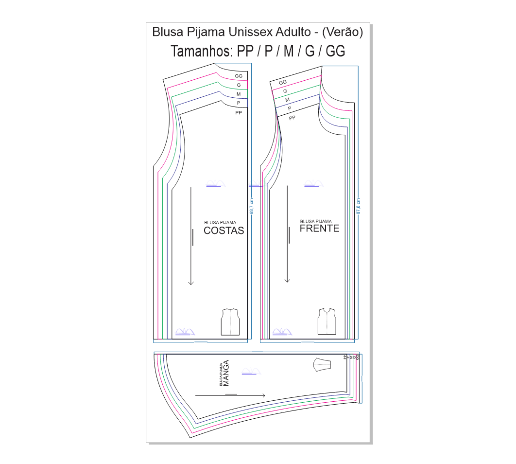 Molde Blusa de Pijama Unissex Verão (PP ao GG) Arquivo PDF + Editável