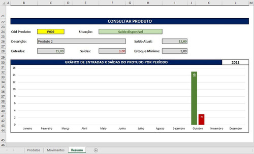 - - Consulta do saldo, entradas e saídas, dos Produtos, através do resumo, com gráfico.