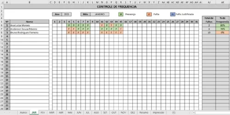 - - Cálculo automático da frequência dos alunos, com diferenciação por cores.
