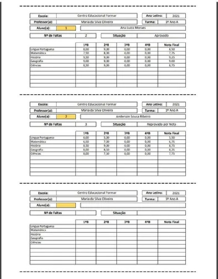 - - Impressão automática dos boletins de cada aluno (layout com 3 por folha).