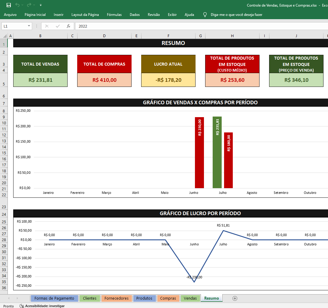 - - Visualização do Resumo dos Valores de Compras, Vendas, Estoque e Lucro.